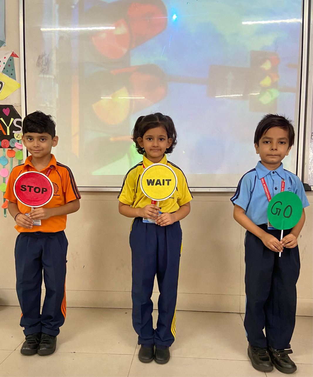Through simple dialogues and dramatized scenarios, our little ones portrayed, cross the road safely using the zebra crossing, the meaning of basic traffic light colors – red for stop, yellow for wait, and green for go, helmets are essential while riding bicycles or two-wheelers.